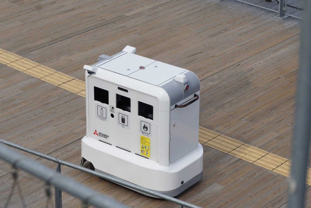 大屋根リングの上を走行するゴミ分別ゴミ箱。