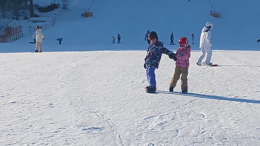 姉ちゃんはもう少しでターンできるところまできたけど、木の葉滑りでびっくりするくらい早くて、中級コースもスイスイ滑っていくのでスピードへの恐怖心はそんなにないんやろうって感じ。