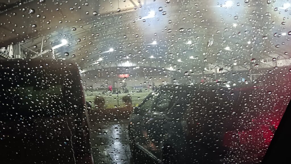そんで、練習が2時間あるのでその間に近くの郵便局に用事がある母ちゃんについていったら、途中からポツポツ雨が降ってきて、郵便局から帰る頃にはどしゃ降り。。。