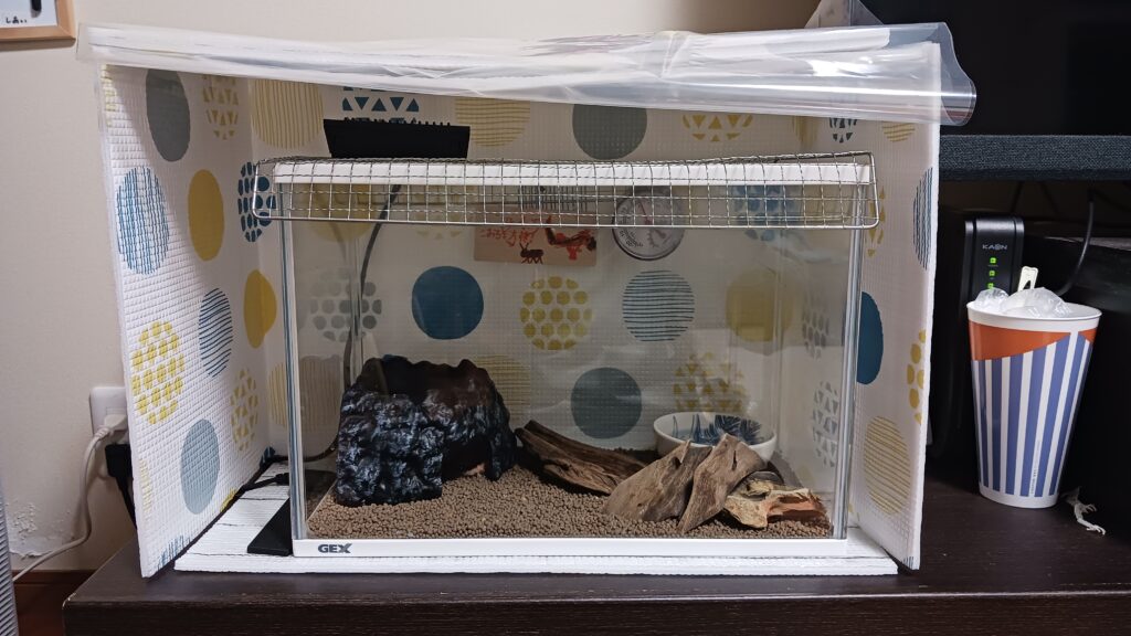 爬虫類飼育ブログ見たりYouTubeを見たりしていろいろと調べてくれたんやけど、ヒーティングトップSを買って様子をみてたんやけど、だいたい25~30℃くらいの室温を維持してたかなぁ。