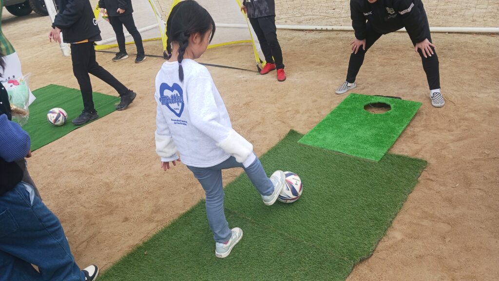 地元の女子サッカーチームの選手が来て、ボールを穴に入れるゲームをしたんやけど、姉ちゃんはなかなか入らなかったみたい。。。