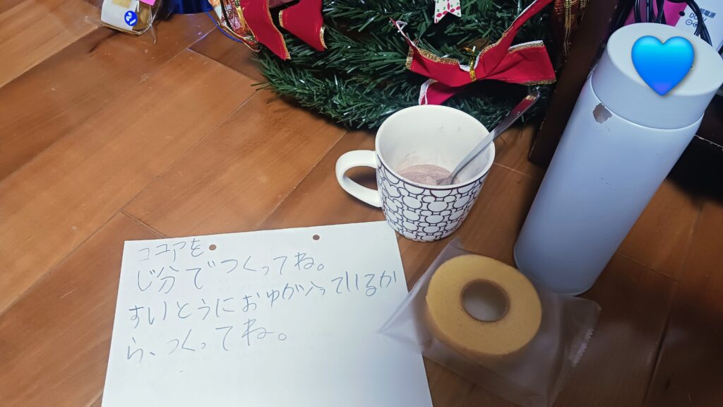 姉ちゃんはサンタさんにココアとバームクーヘンを感謝の気持ちでわたしたいってことでお手紙書いて置いてたよ〜