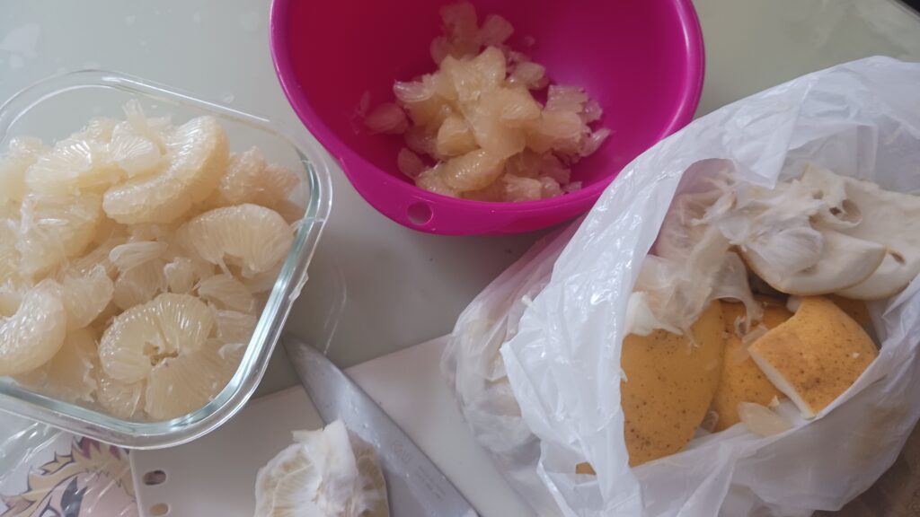 たくさん文旦頂いたので、分厚い皮と中の白い皮を剥いてから兄ちゃん姉ちゃんに出したんやけど。。。